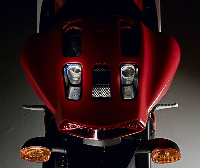 The name Desmosedici comes from Desmo for the Desmodromic valves and sedici which means 16 in Italian, as in 16 titanium valves. The 989cc L-four will be putting out over 200 horsepower and come complete with a three year warranty. The entire package is draped in full Ducati Red carbon fiber bodywork. The bike is without a doubt a stunner.