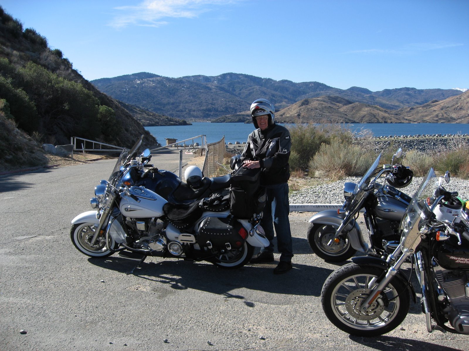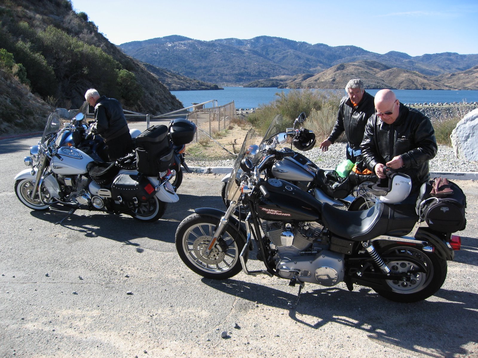 4 Motorcycles and 3 riders, Jimmy Wayne and Harold with the lake behind the dam where it's supposed to be.