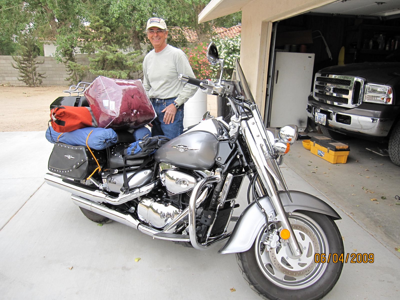 Thursday, June 4,2009 Our first day on the road heading for Flagstaff, AZ as our over night stay of a 2 day ride. Ken is on a 2007 Suzuki C90T (1,500 cc)and is carrying all the usual stuff plus several pieces of camping gear including a good size tent, camp stove, sleeping bag, small ice chest, and a folding camp chair. He is really ready for two nights of camping at the Potato Ranch. There are 4 pounds of bungee cords holding all this together it seems. I have my sissy-bar bag stuffed with clothing and things plus bottles of water and Gatorade, but brought along a green duffel bag with my winter jacket, extra pair of jeans and room for dirty clothes on the way back. For this trip I wore my Australian Draggin Jeans with some hip inserts and the knee armor just in case.