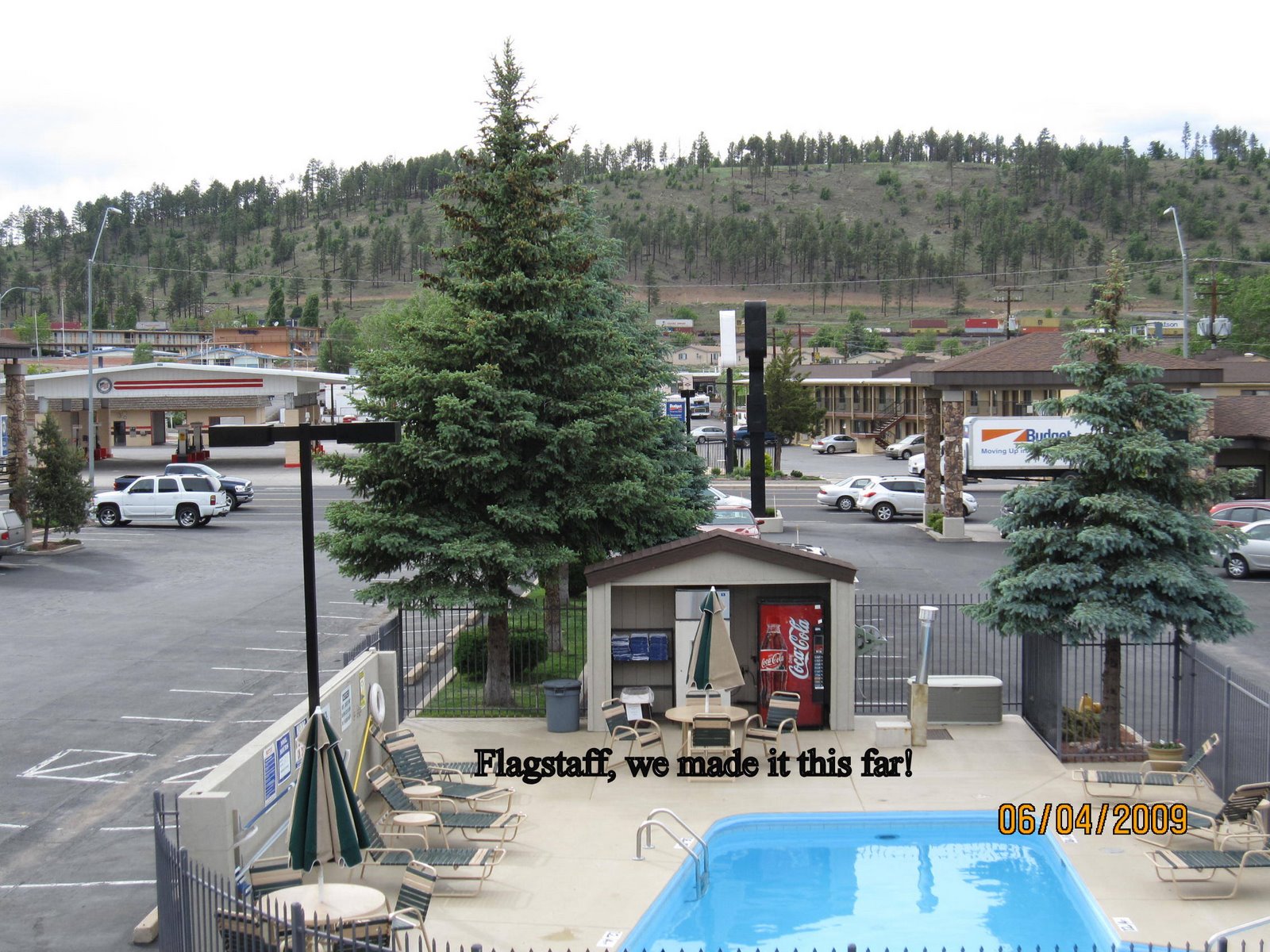 and then on to Flagstaff. The views along the road are of wide open stretches of desert and rolling hills and mostly uninteresting vistas. The road is good, traffic fairly light with trucks the main obstacle course to deal with. I'm in front and the pace is about 75 mph or so. Arriving in Flagstaff I had mapped out where the motel is but still never know if I will spot it and follow the correct road, but we hit it dead bang right on.