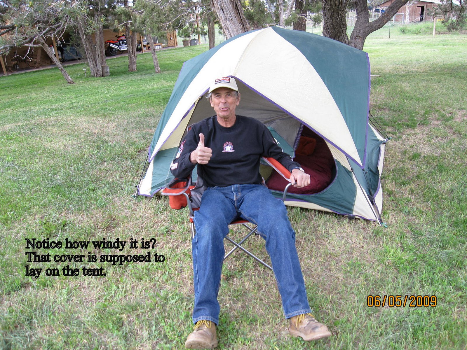 Suddenly the wind picks up and Ken's now set up tent is really getting whipped around.